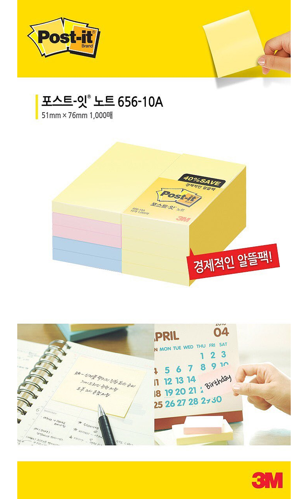 | 품명 및 모델명 | 3M 포스트잇알뜰팩 656-10A(51x76mm,노랑(6)블루(2)핑크(2)) |
