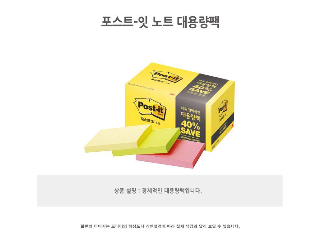 | 품명 및 모델명 | 3M 포스트잇대용량팩 657-15A(102x76mm노랑(11)그린(2)핑크(2)) |
