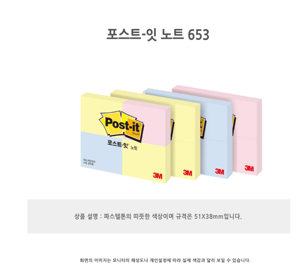 | 품명 및 모델명 | 3M 포스트잇 3색 653(레인보우3색,4팩, 51x38mm) |