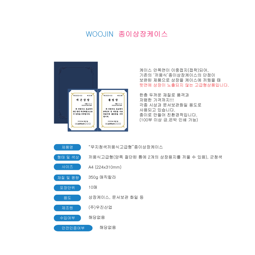 | 품명 및 모델명 | 종이상장케이스(A4/고급형/군청색/10매/팩/우진) |