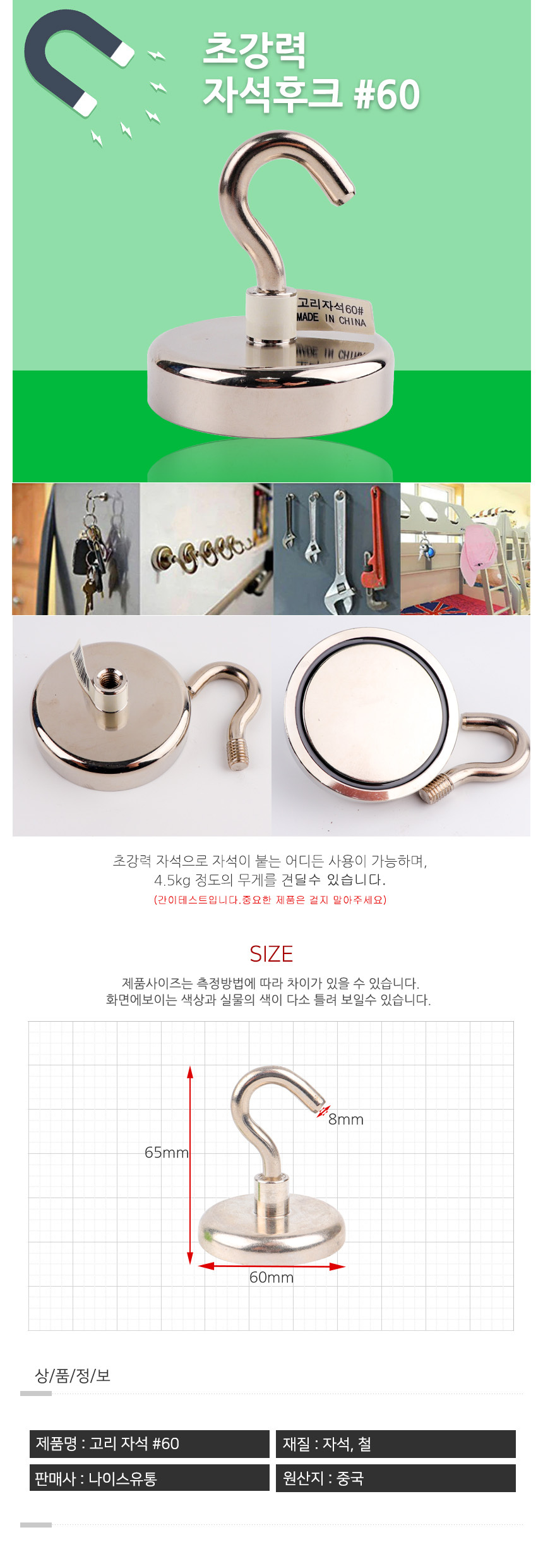 초강력 자석후크 60mm 고리 다용도걸이