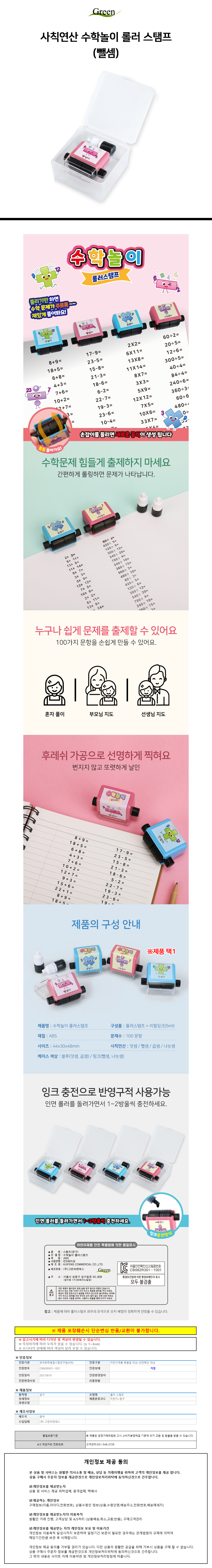 그린피앤에스 숫자도장 사칙연산 수학놀이 롤러 스탬프 (뺄셈)