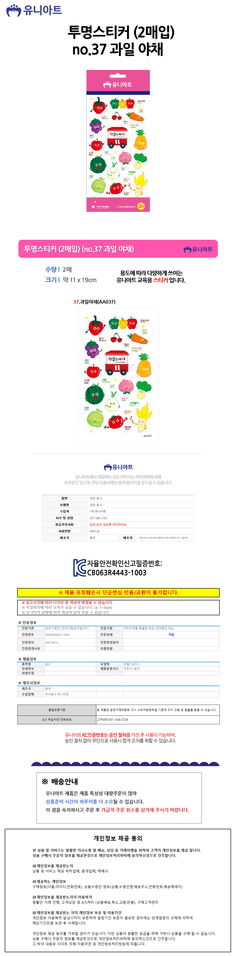 유니아트 1500 투명스티커 (2매입) (no.37 과일 야채)