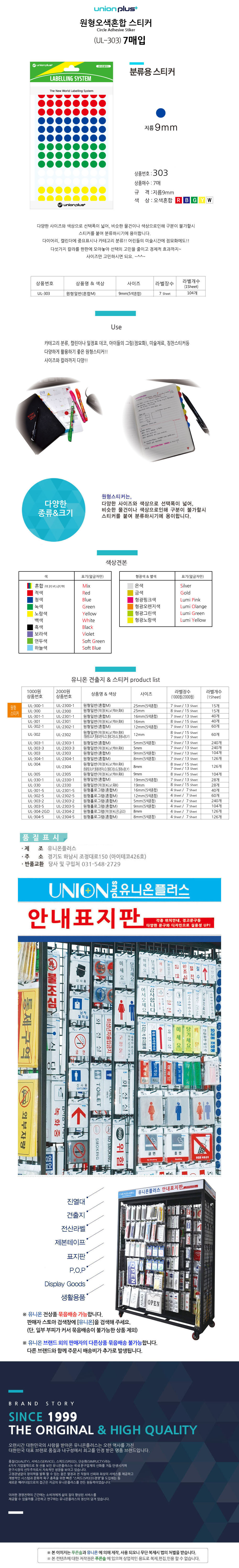 유니온 스티커 원형 5색혼합 지름9mm 7매입 UL-303