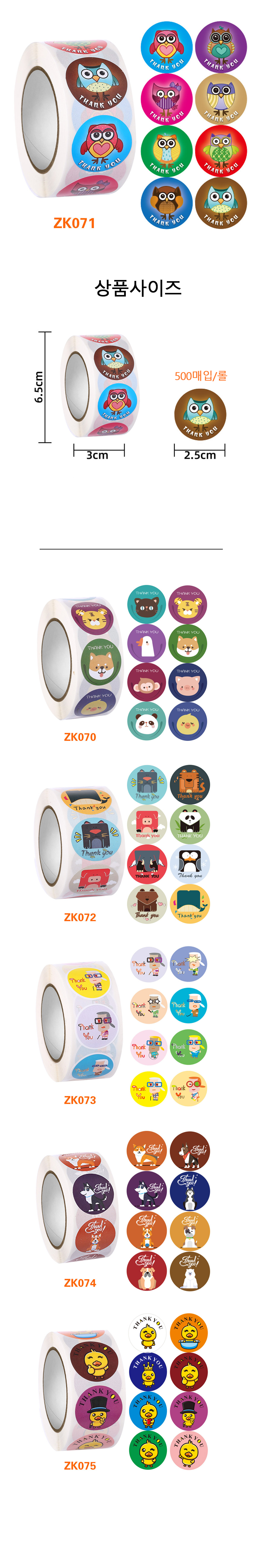 부엉이 캐릭터 THANKYOU스티커 선물 포장 롤스티커 500PS KK123