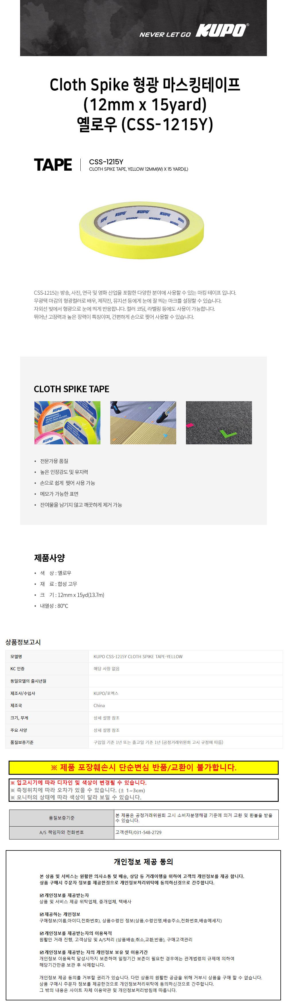 KUPO 마스킹테이프 형광 (12mmx15yard) (옐로우) (CSS-1215Y)