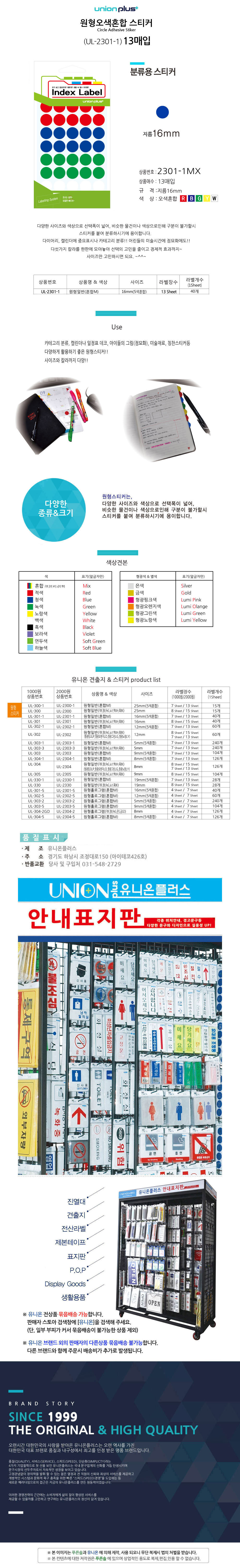 유니온 스티커 원형 5색혼합 지름16mm 13매입 UL-2301-1
