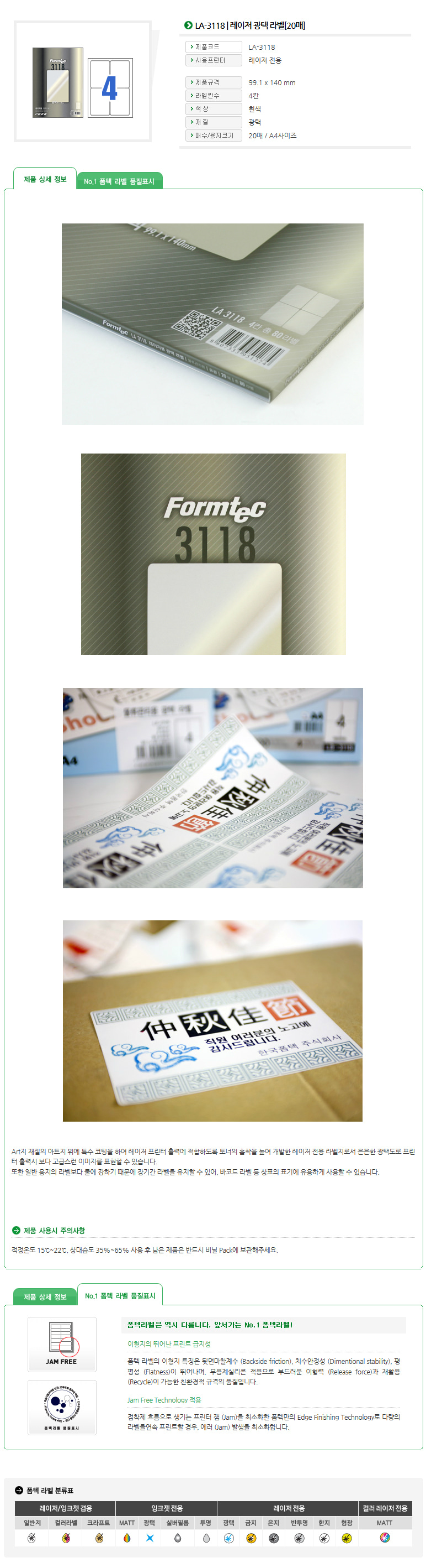 품명 및 모델명 라벨지/한국폼텍 LA-3118 [4칸/20매]