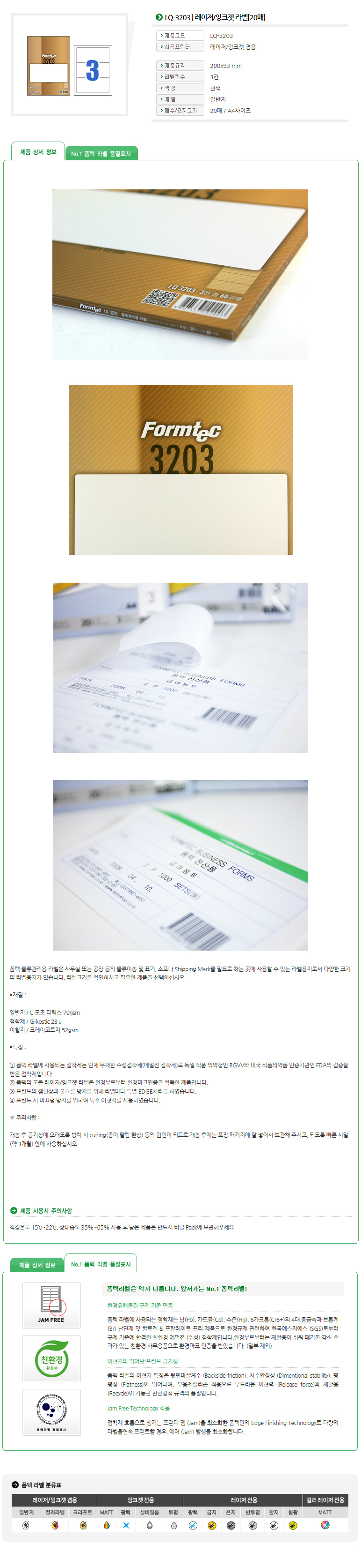 품명 및 모델명 라벨지/한국폼텍 LQ-3203 [3칸/20매]