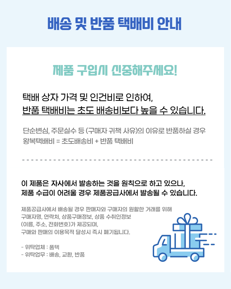 | 제품하자가 아닌 소비자의 단순변심, 착오구매에 따른 청약철회 시 소비자가 부담하는 반품비용 등에 관한 정보 | 배송ㆍ교환ㆍ반품 상세설명페이지 참고 |