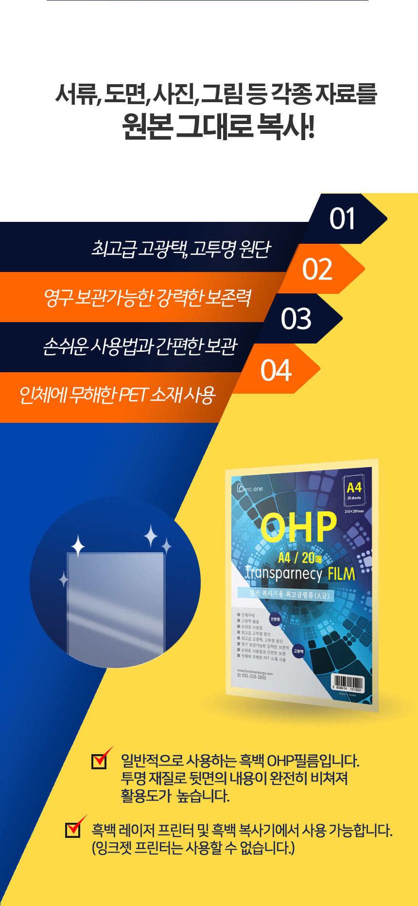 베스트원 OHP 필름 A4 20매 흑백 레이저 프린터용