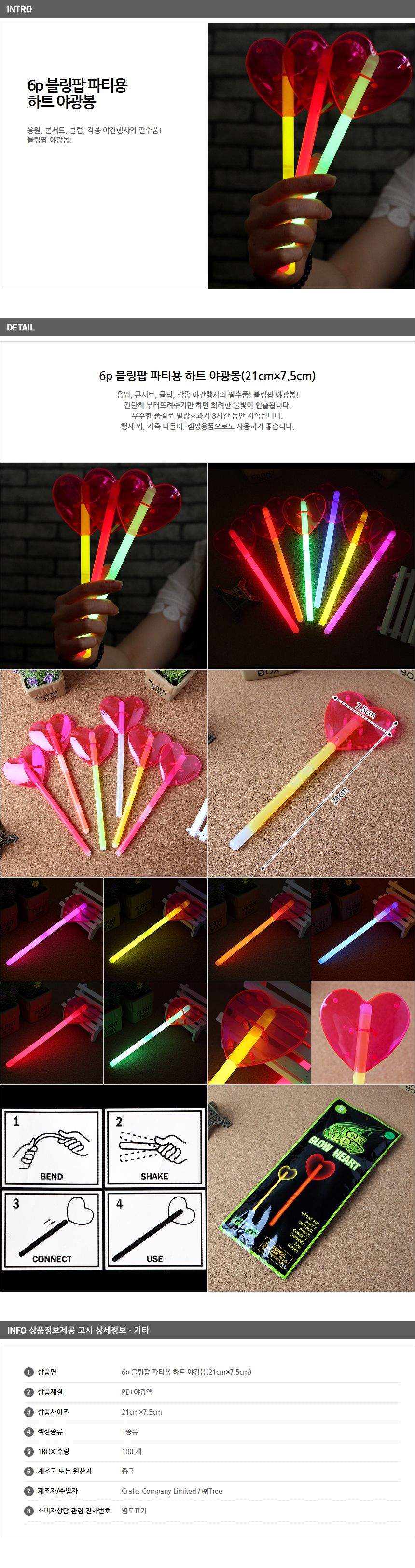 6p 블링팝 파티용 하트 야광봉(21cmx7.5cm)
