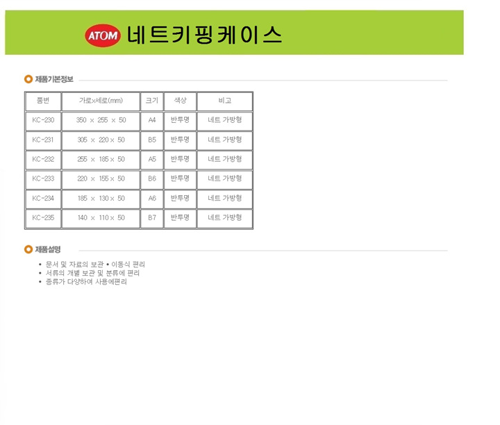 품명 및 모델명 아톰 키핑케이스(A5) KC-232(A5 255x185mm)