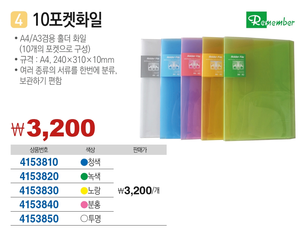 | 품명 및 모델명 | 리멤버 10포켓화일(A4 240x310x10mm 노랑) |