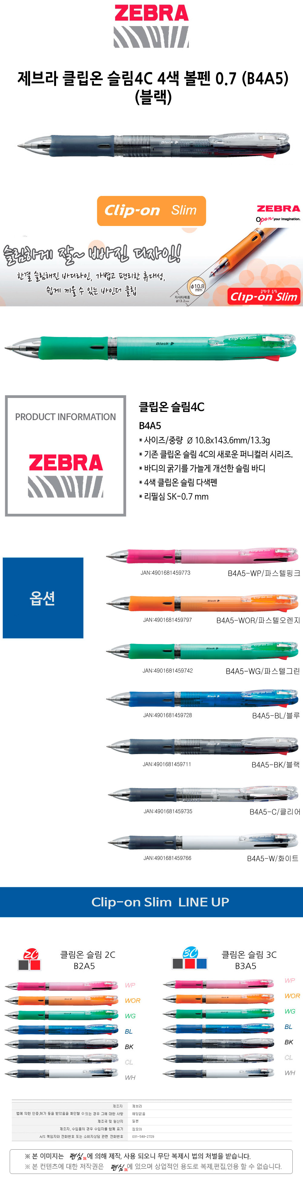 제브라 클립온 슬림4C 4색 볼펜 0.7 B4A5 블랙