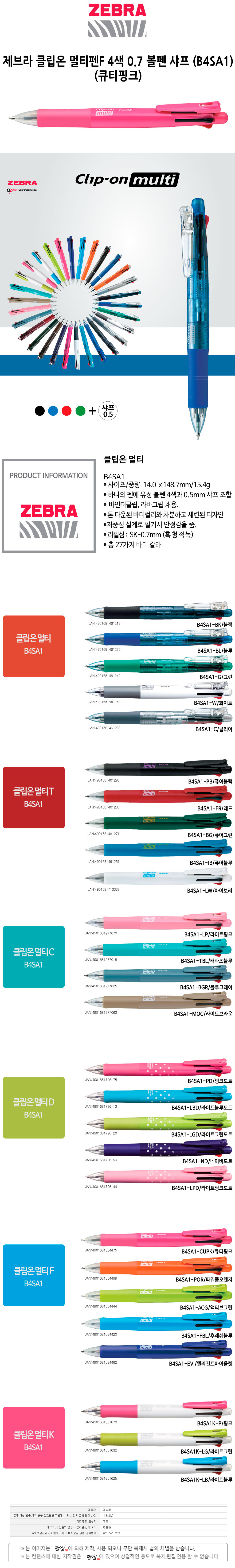 제브라 클립온 멀티펜F 4색 0.7 볼펜 샤프 B4SA1 큐티핑크