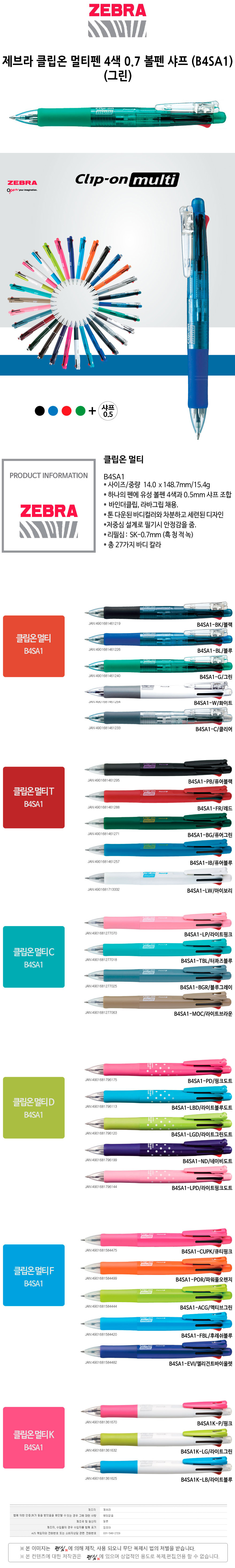 제브라 클립온 멀티펜 4색 0.7 볼펜 샤프 B4SA1 그린