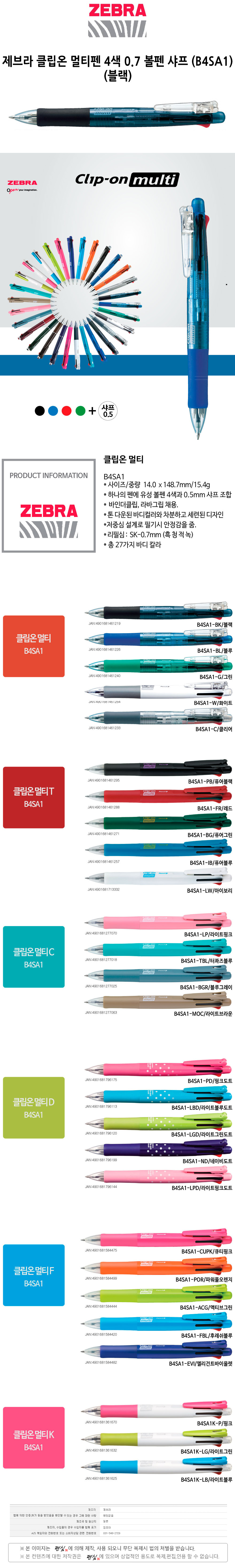 제브라 클립온 멀티펜 4색 0.7 볼펜 샤프 B4SA1 블랙