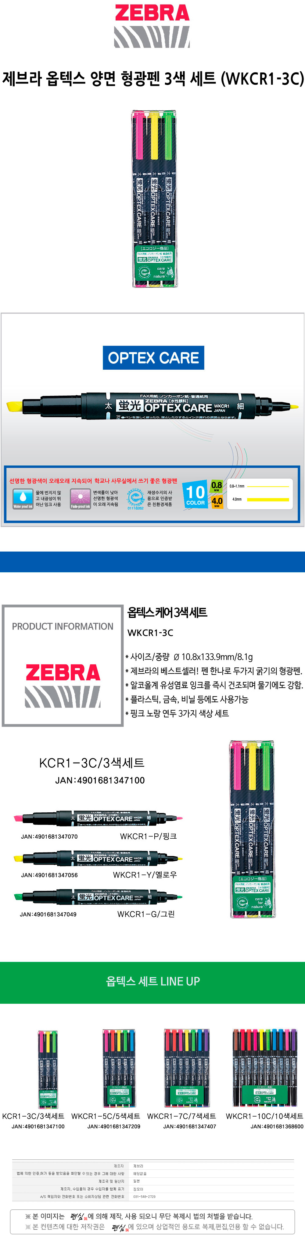제브라 옵텍스 양면 형광펜 3색 세트 WKCR1-3C