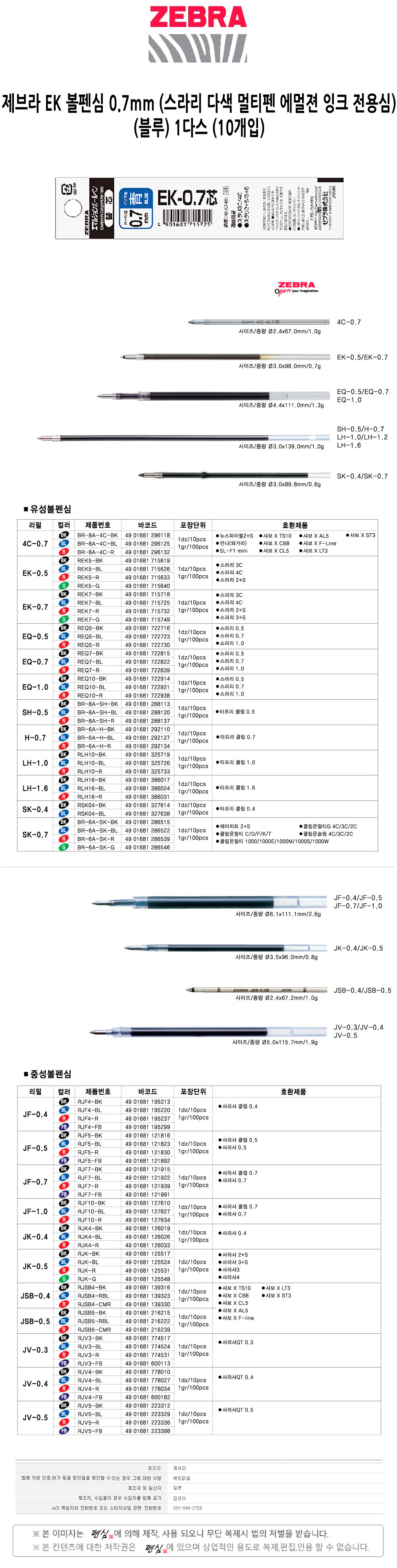제브라 EK 볼펜심 0.7 스라리 다색 멀티펜 에멀젼 잉크 전용심 블루 1다스 10개입