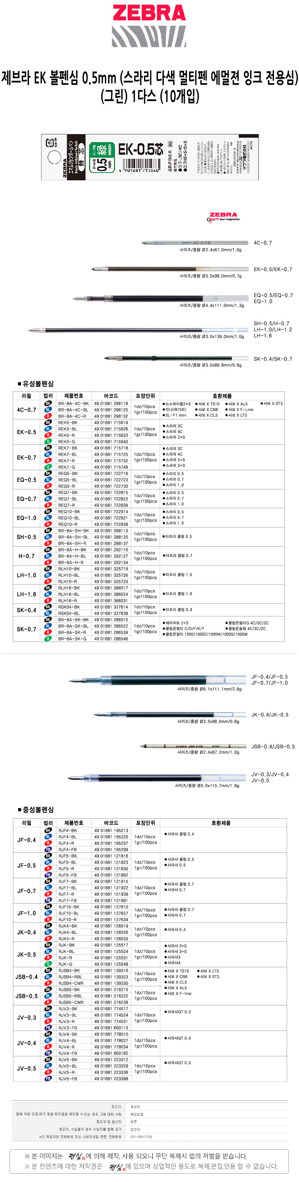 제브라 EK 볼펜심 0.5 스라리 다색 멀티펜 에멀젼 잉크 전용심 그린 1다스 10개입