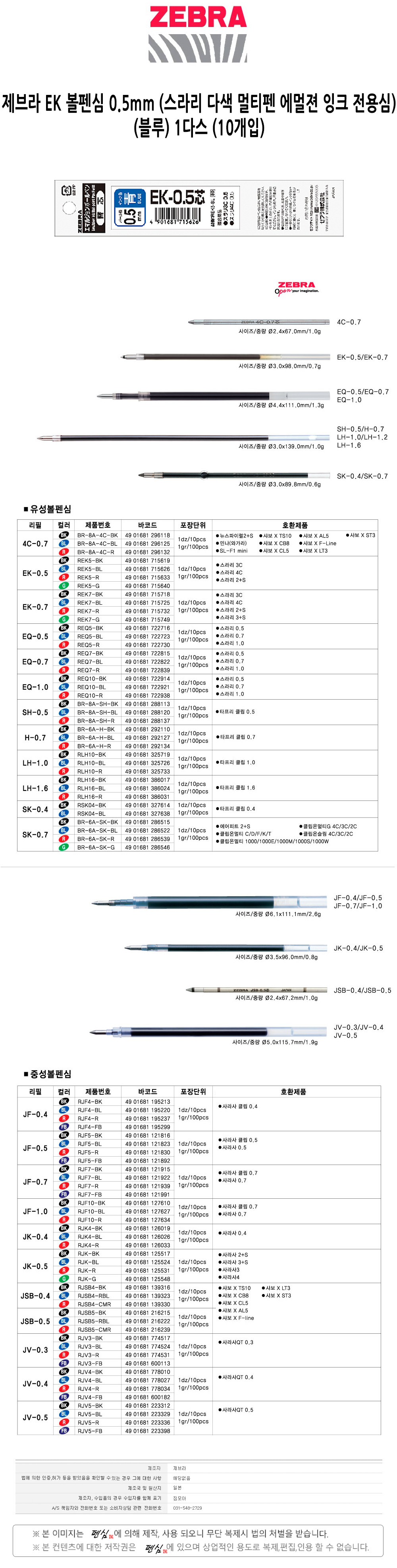 제브라 EK 볼펜심 0.5 스라리 다색 멀티펜 에멀젼 잉크 전용심 블루 1다스 10개입