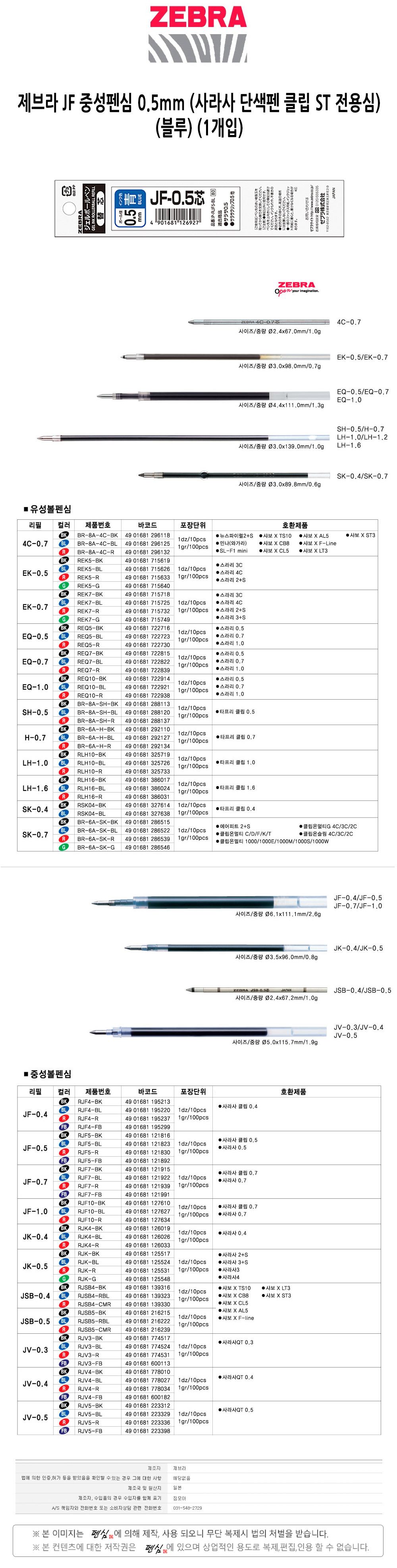 제브라 JF 중성펜심 0.5 사라사 단색펜 클립 ST 전용심 블루 1개입