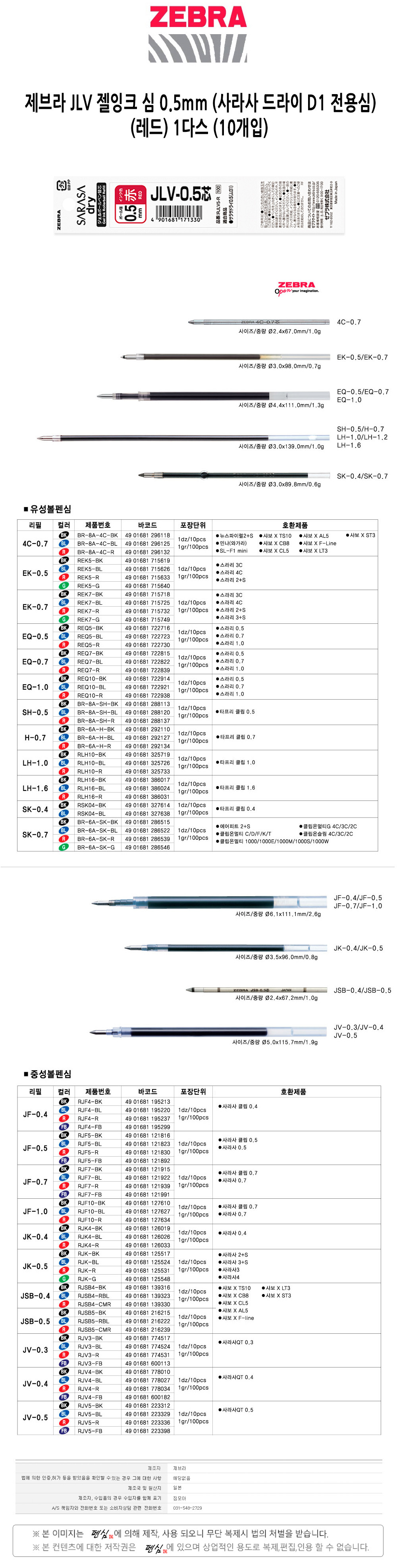 제브라 JLV 젤잉크 심 0.5 사라사 드라이 D1 전용심 레드 1다스 10개입