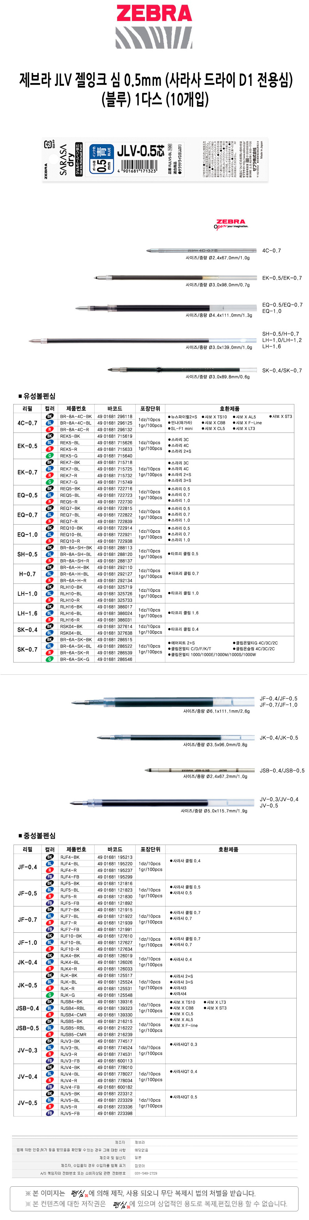 제브라 JLV 젤잉크 심 0.5 사라사 드라이 D1 전용심 블루 1다스 10개입