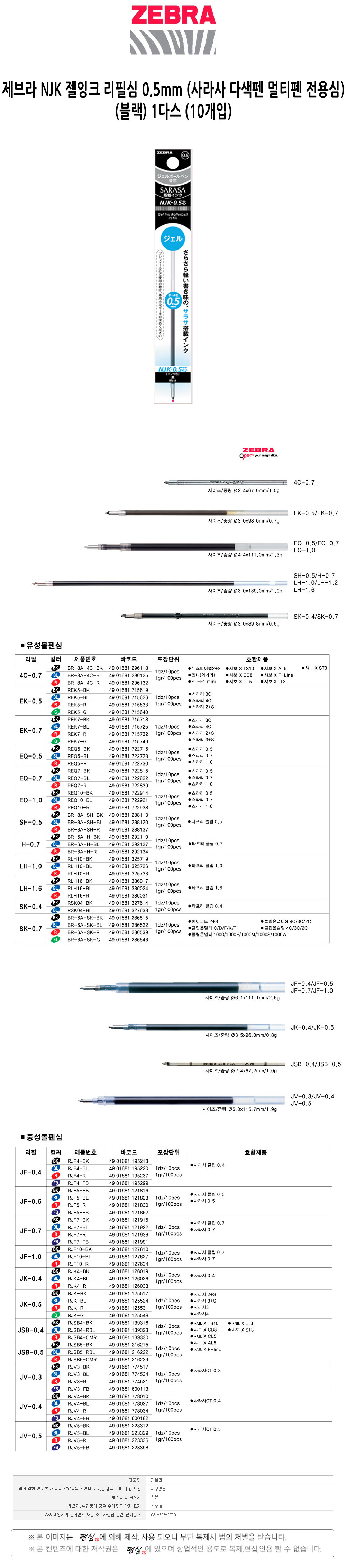 제브라 NJK 젤잉크 리필심 0.5 사라사 다색펜 멀티펜 전용심 블랙 1다스 10개입