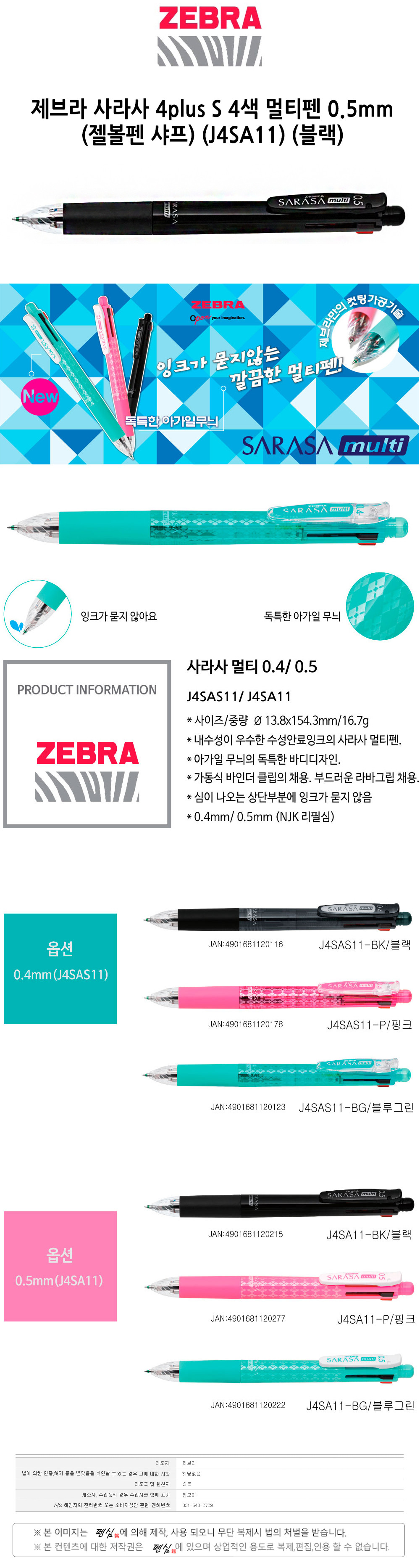 제브라 사라사 4plus S 4색 멀티펜 0.5 젤볼펜 샤프 J4SA11 블랙