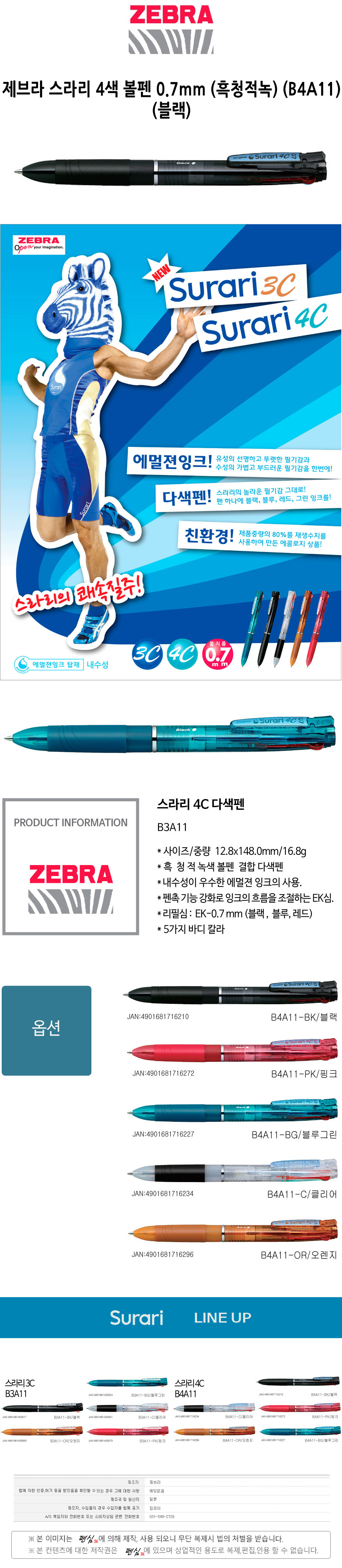 제브라 스라리 4색 볼펜 0.7mm 흑청적녹 B4A11 블랙