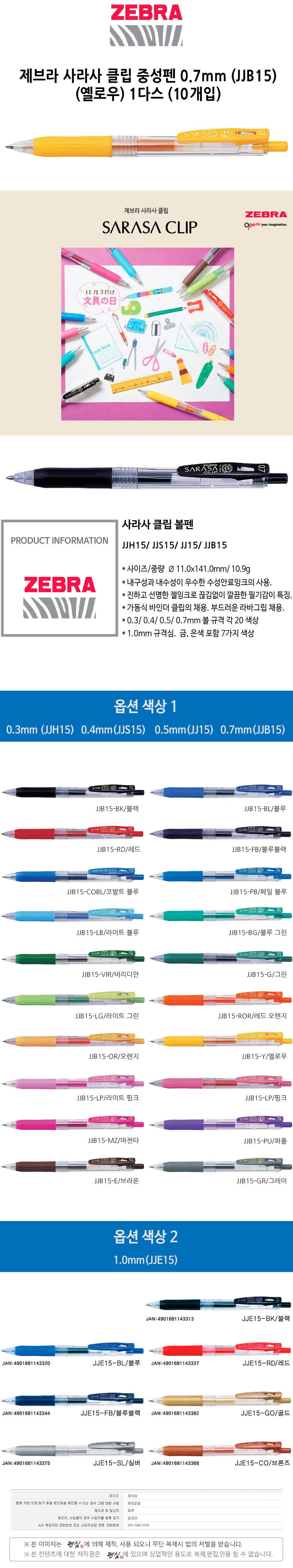 제브라 사라사 클립 중성펜 0.7 JJB15 옐로우 1다스 10개입