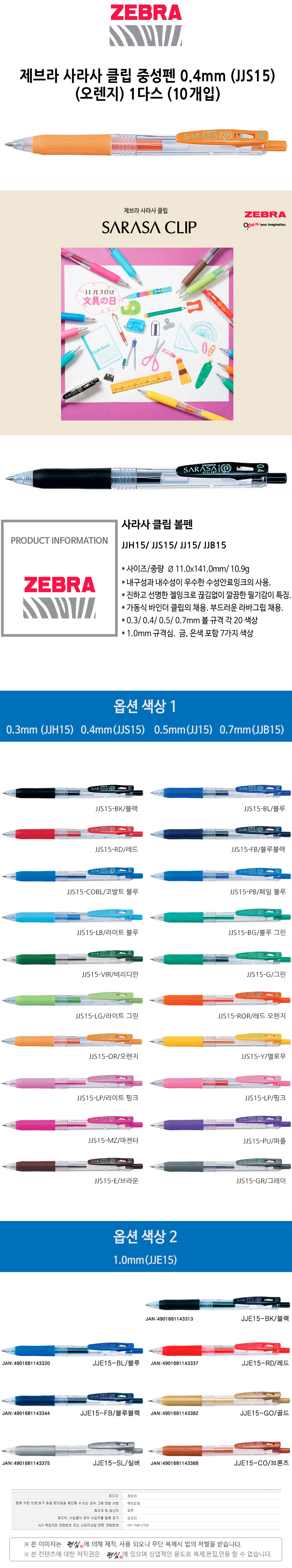 제브라 사라사 클립 중성펜 0.4 JJS15 오렌지 1다스 10개입
