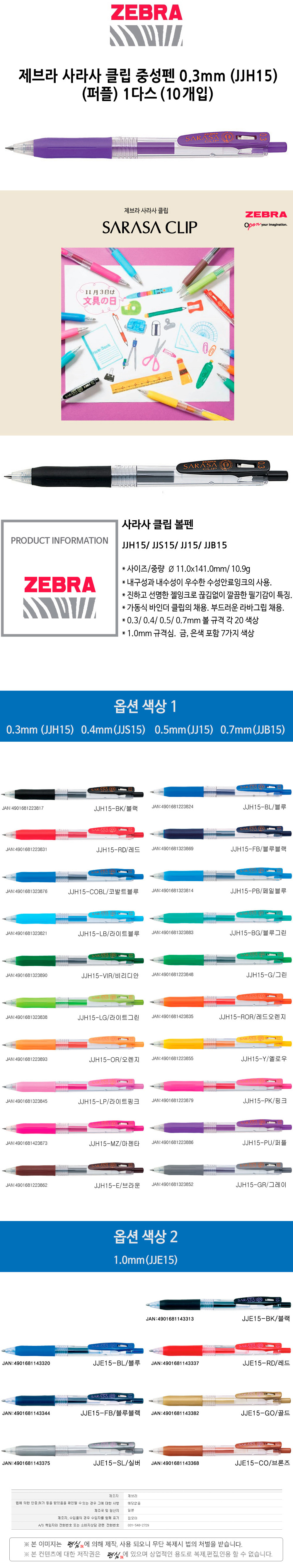 제브라 사라사 클립 중성펜 0.3 JJH15 퍼플 1다스 10개입