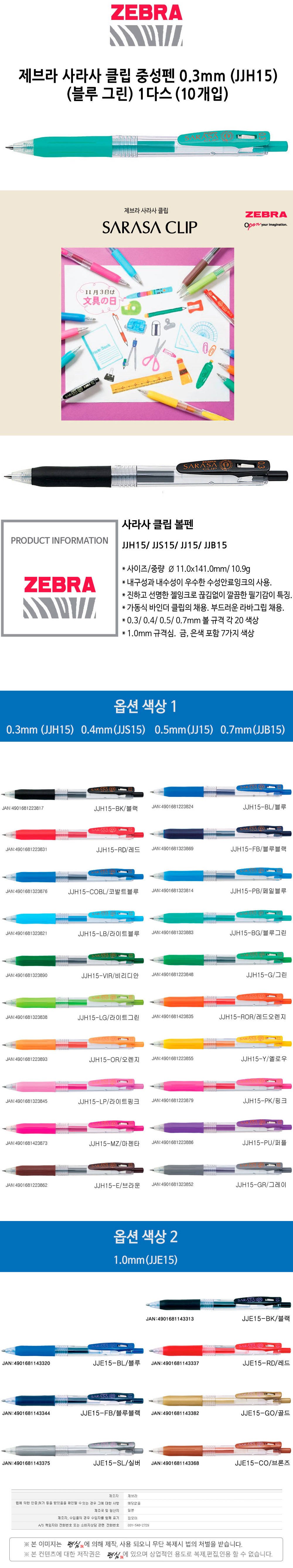 제브라 사라사 클립 중성펜 0.3 JJH15 블루 그린 1다스 10개입