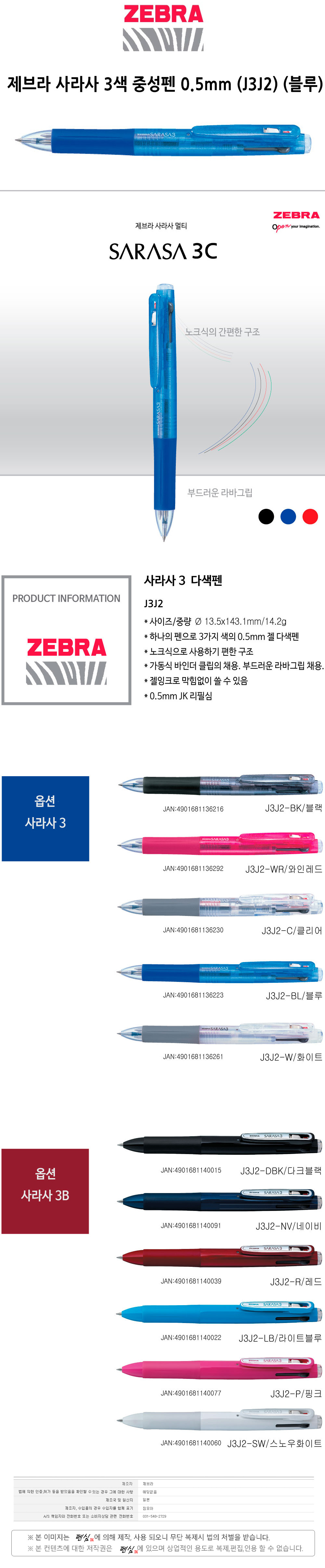 제브라 사라사 3색 중성펜 0.5mm J3J2 블루