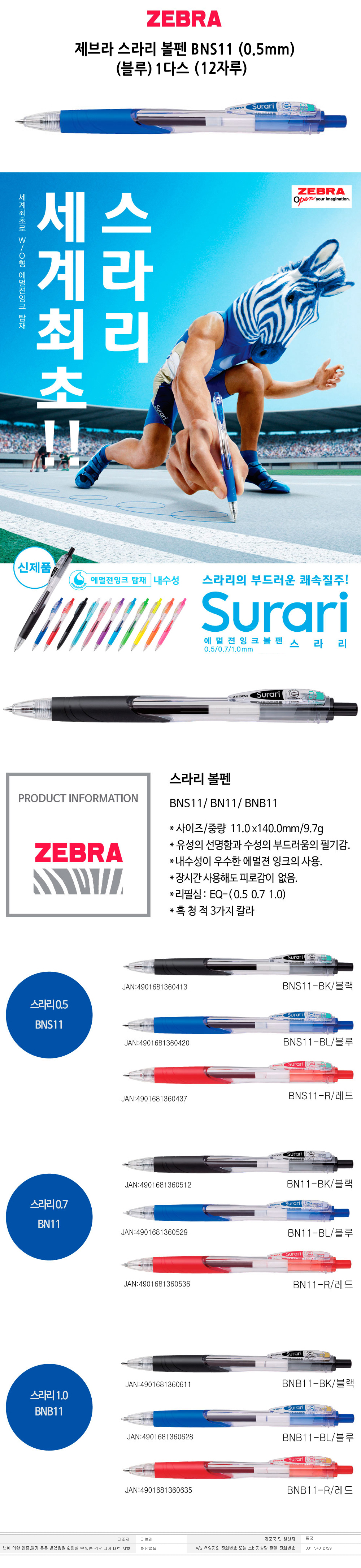 제브라 스라리 볼펜 BNS11 0.5mm 1다스 12자루 블루