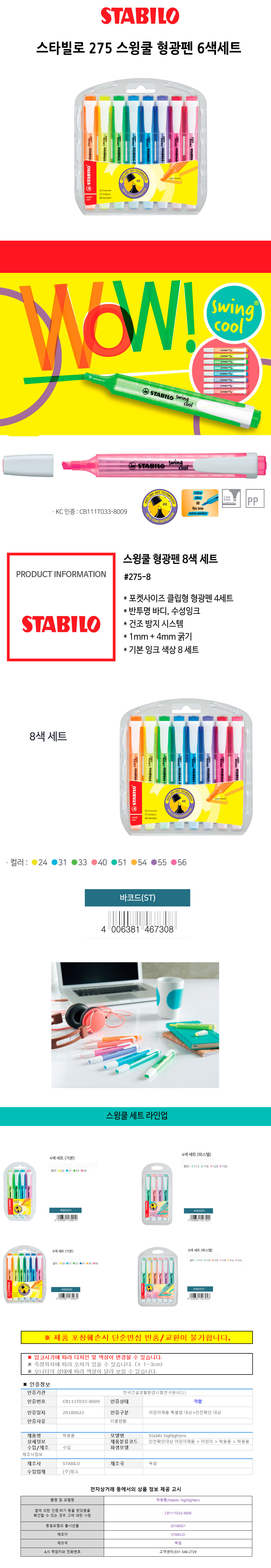 스타빌로 275 스윙쿨 형광펜 8색세트