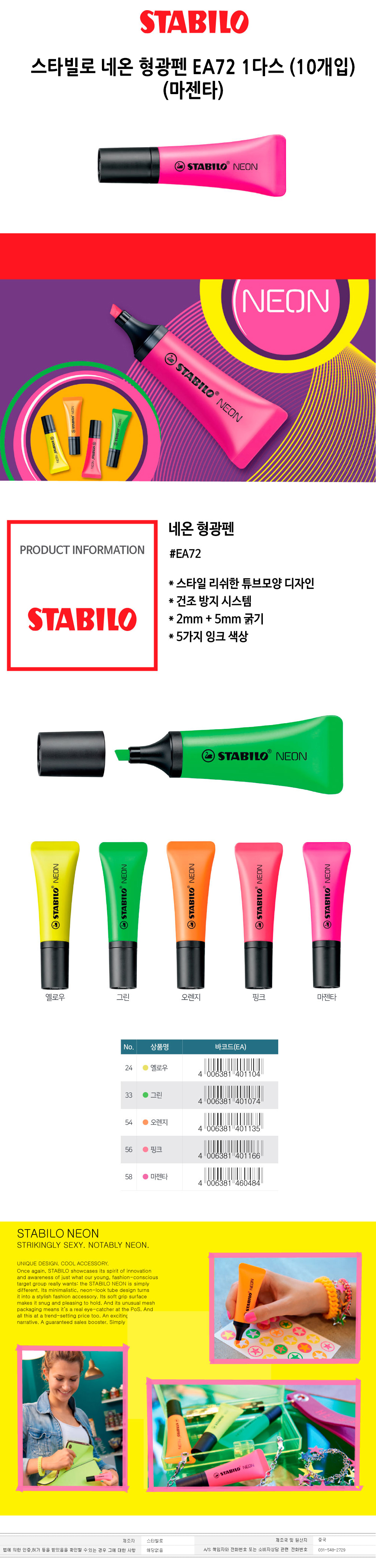 스타빌로 네온 형광펜 EA72 1다스 10개입 마젠타