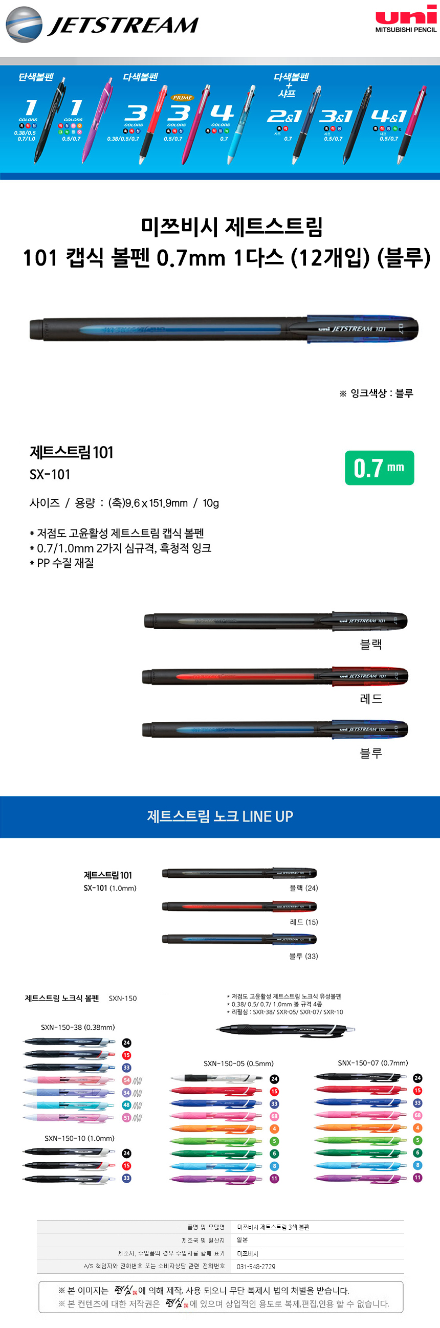 미쯔비시 제트스트림 101 캡식 볼펜 0.7mm 1다스 12개입 블루