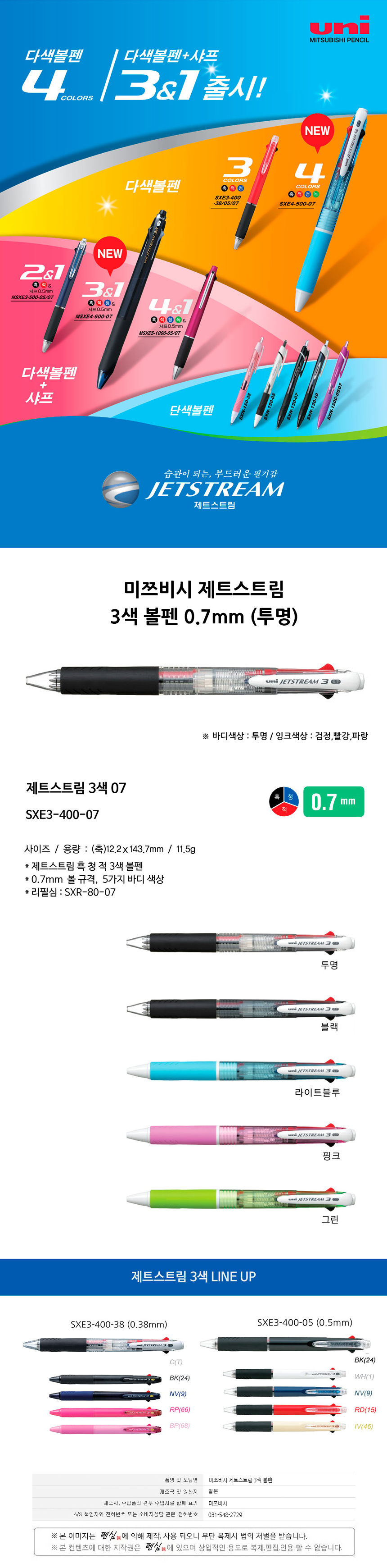 미쯔비시 제트스트림 3색 볼펜 0.7mm 투명