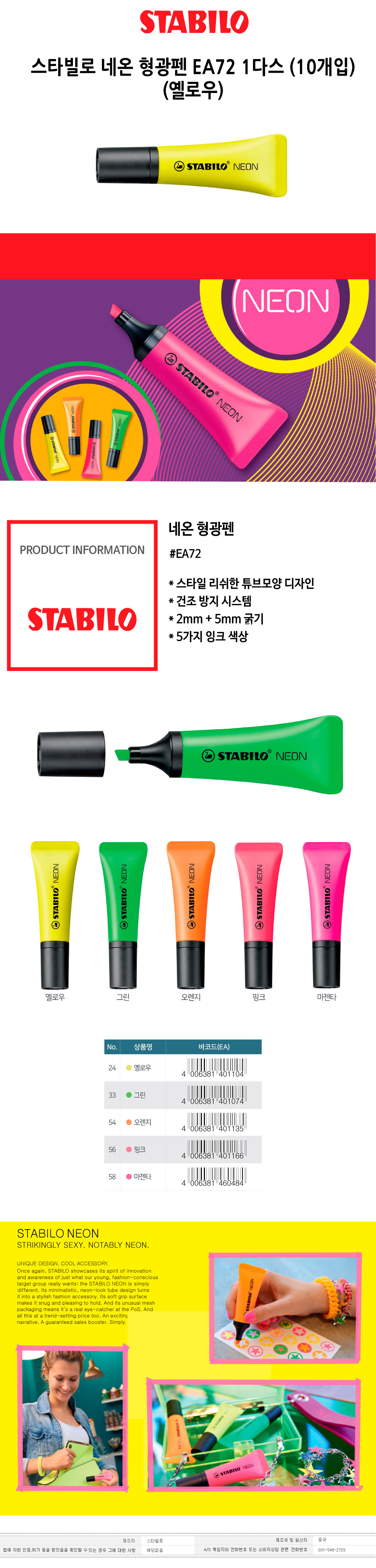 스타빌로 네온 형광펜 EA72 1다스 10개입 옐로우