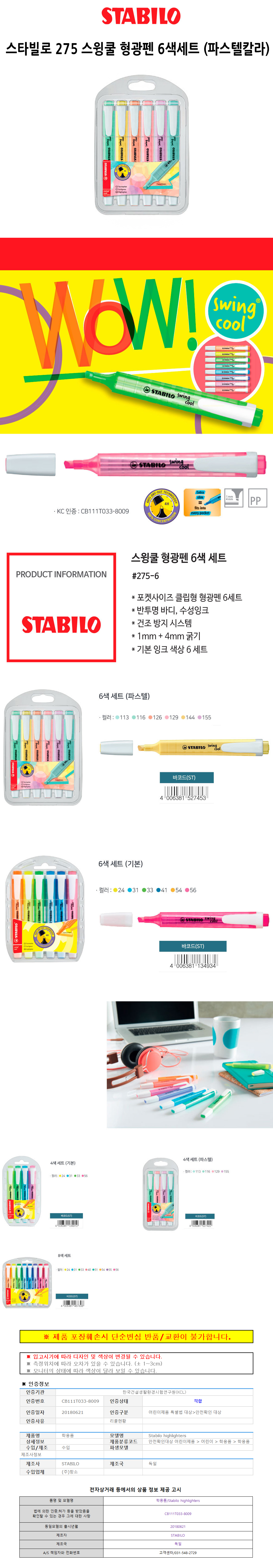 스타빌로 275 스윙쿨 형광펜 6색세트 파스텔칼라