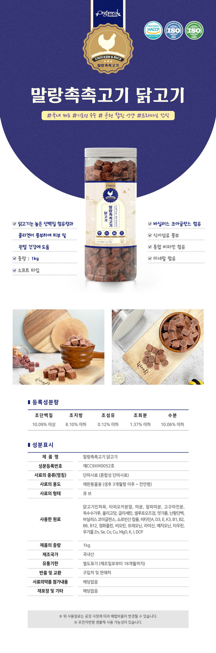 [올가밀] 국산 수제간식 말랑촉촉 닭고기 (1kg)