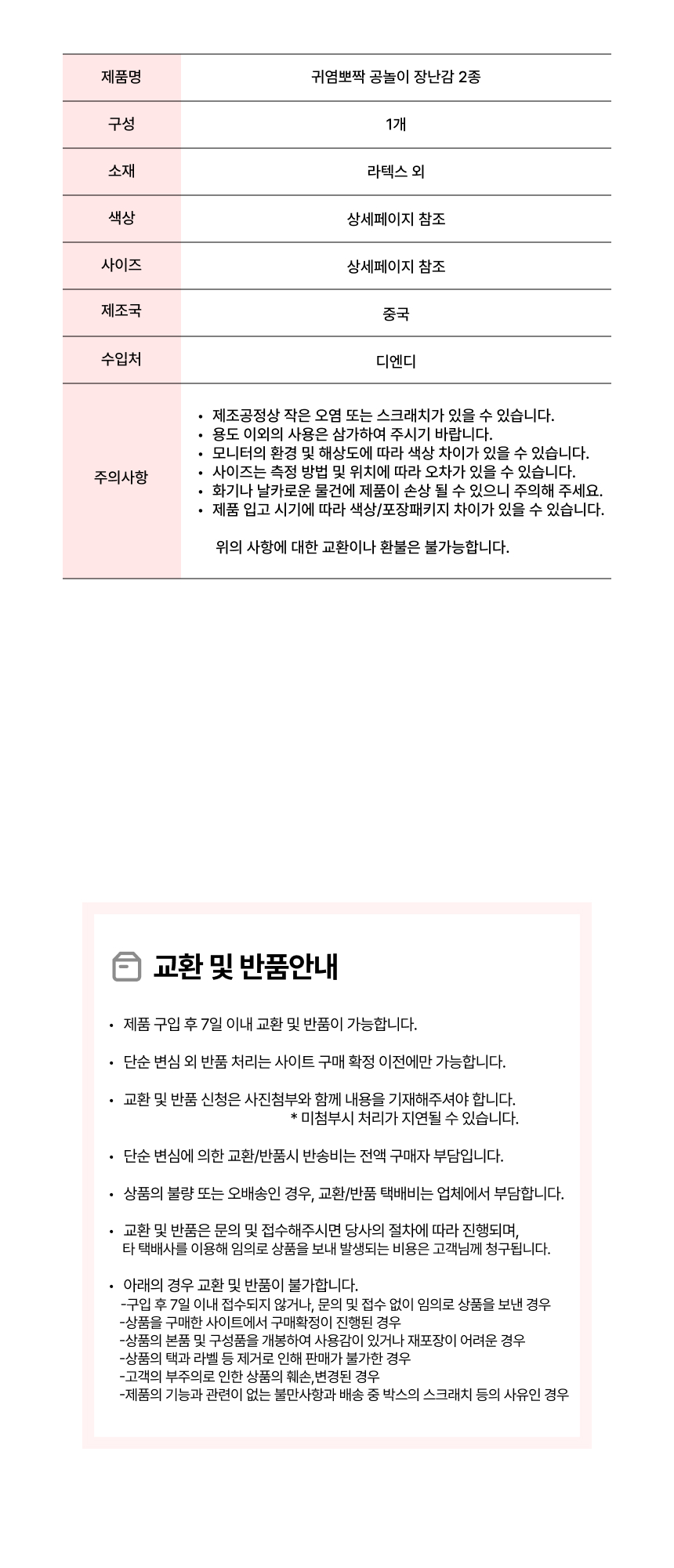 • 단순변심으로 인한 반품 시, 배송 완료 후 7일이 지나면 취소/반품 신청이 접수되지 않습니다.