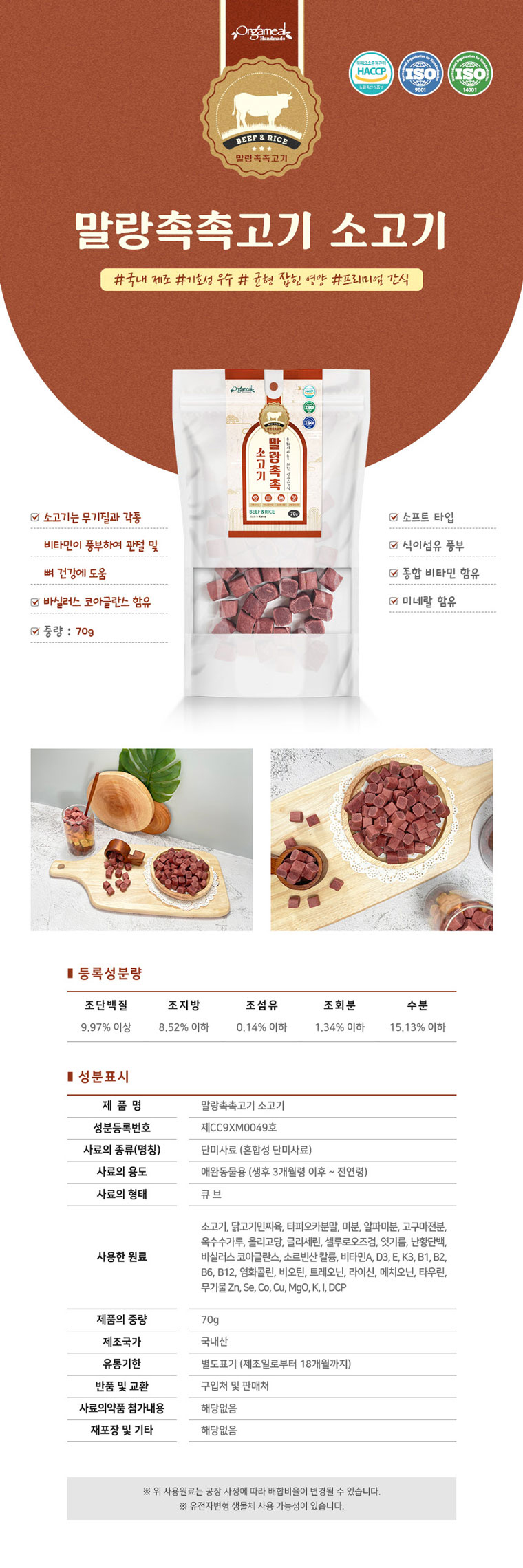 [올가밀] 국산 수제간식 말랑촉촉 소고기 70g