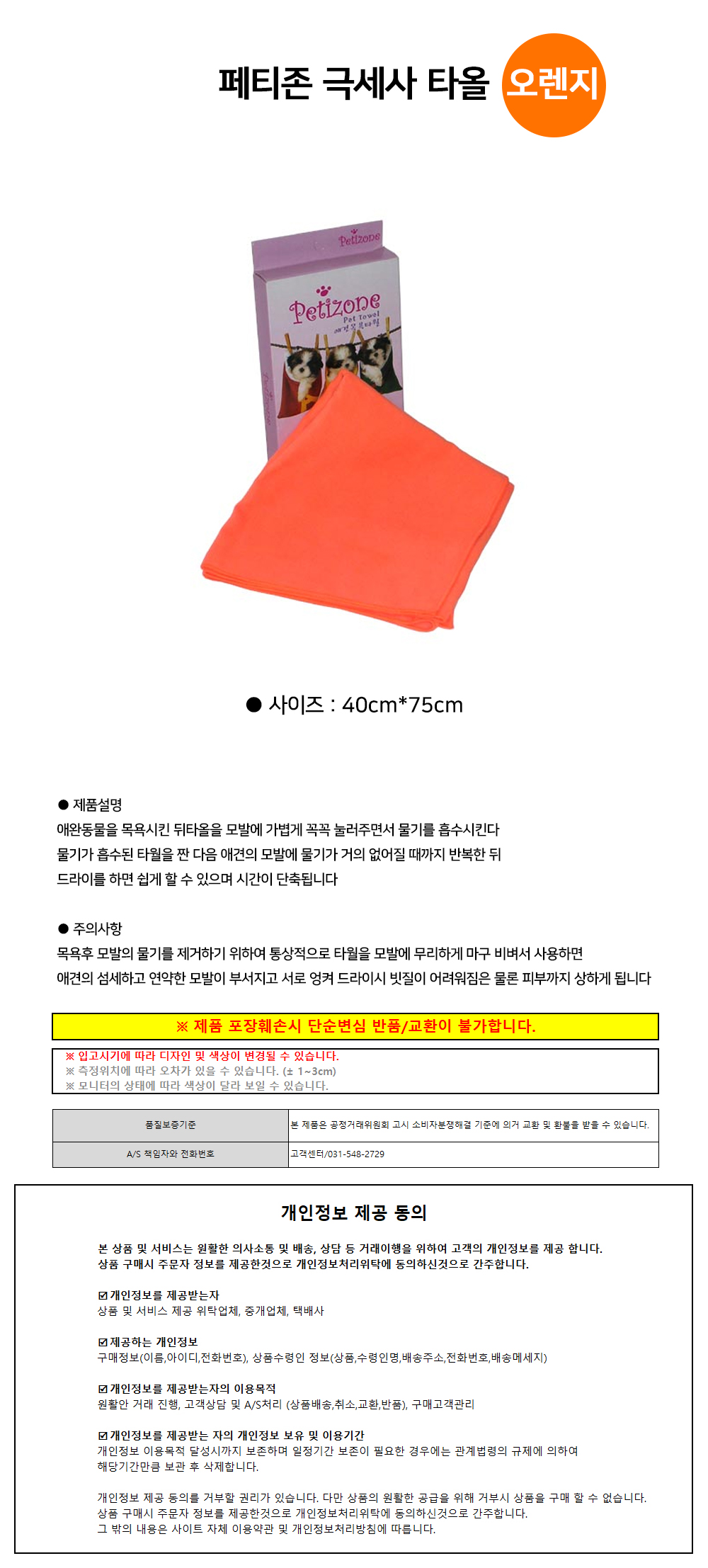 페티존 강아지 페티존 극세사 타올 (오렌지)