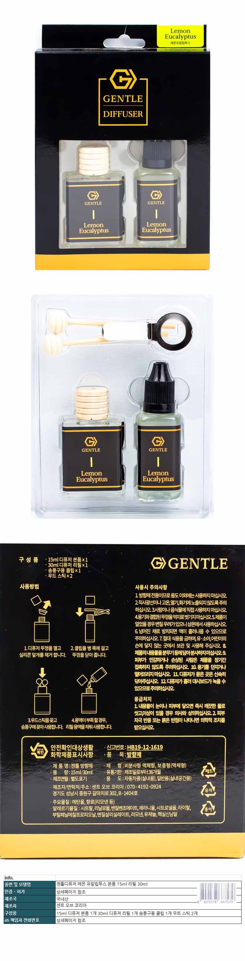 젠틀 디퓨저 레몬유칼립투스 송풍구형 본품15ml 리필30ml
