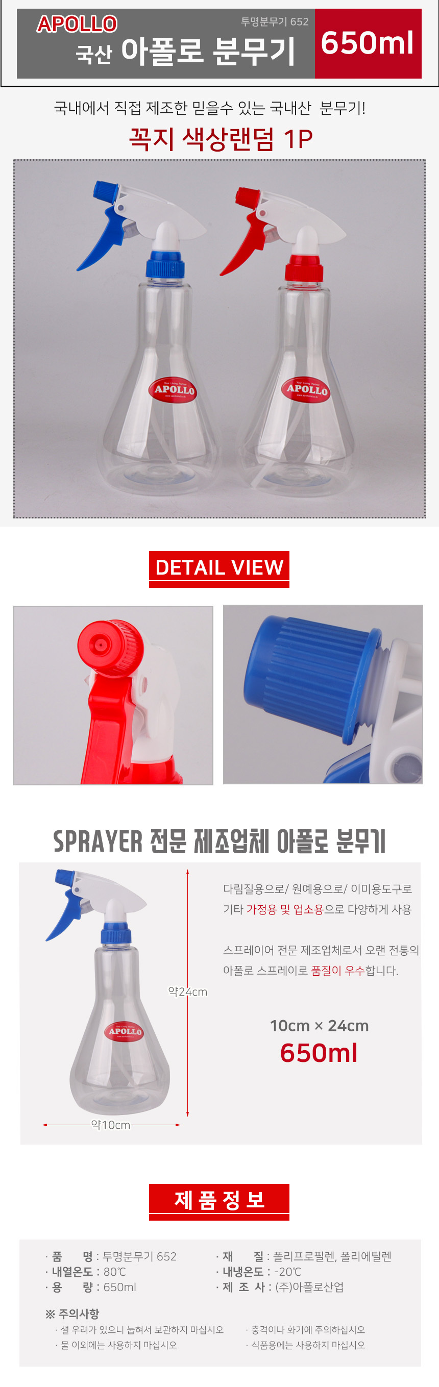 아폴로 투명분무기 650ml 652 스프레이 원예 식물